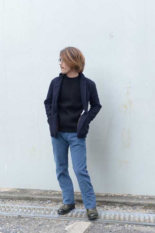パンツは細身のシルエットがメリハリの効いたスタイリングに使えるテラソンのコーディロイパンツを。
