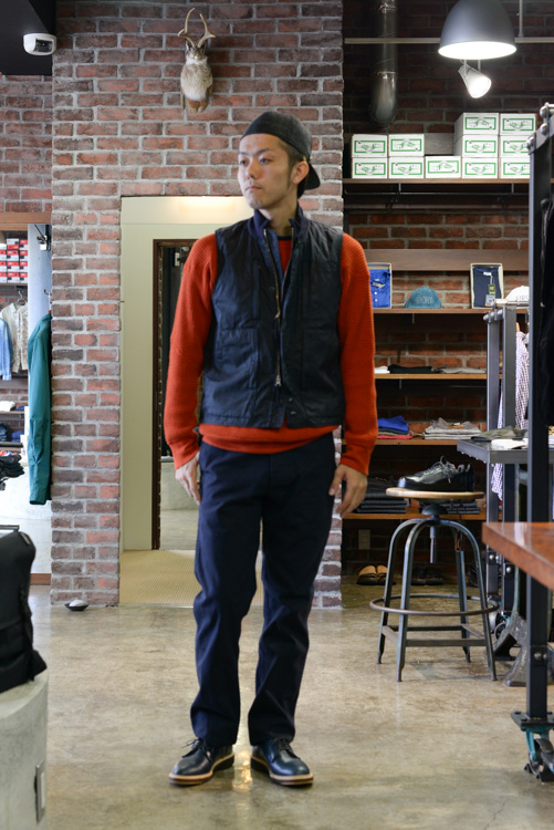 同色のネイビーのパンツや、ベストと合わせたスタイリング。