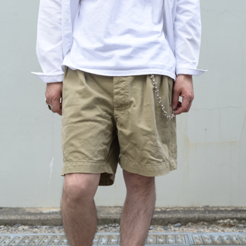 乾いた素材感のコットンツイルと、FRENCH ARMY CHINO SHORT 60’s。