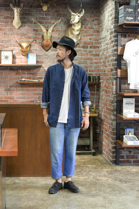 BRU NA BOINNEよりライトオンスのデニム生地を使用したスタンドカラーデニムシャツ、ダーラ スタンドの紹介をさせていただきます。