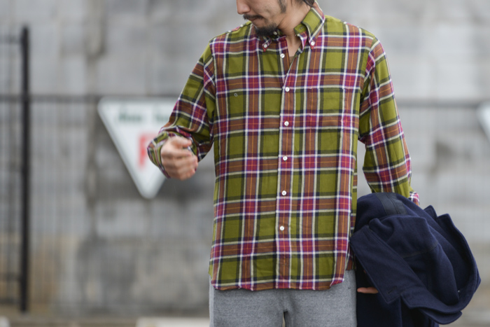 落ち着いたネル地は普段のスタイリングに取り入れやすい汎用性の高さも魅力ですが、柄物や癖のあるアイテムとも是非挑戦していただければと思います。