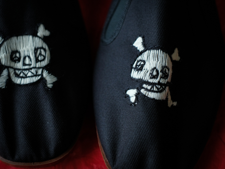 簡素なつくりのカンフーシューズに、手刺繍によるスカルをオン。