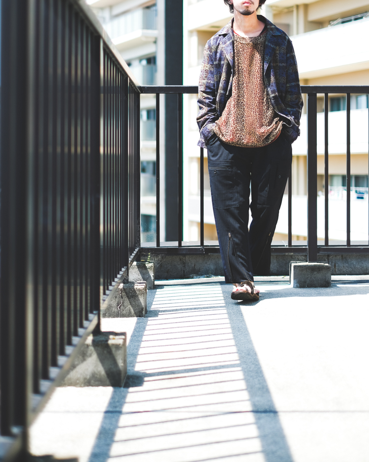 ツヤととろみのある生地を武骨なディティールのパンツに乗せることで、良いギャップを生まれます。
