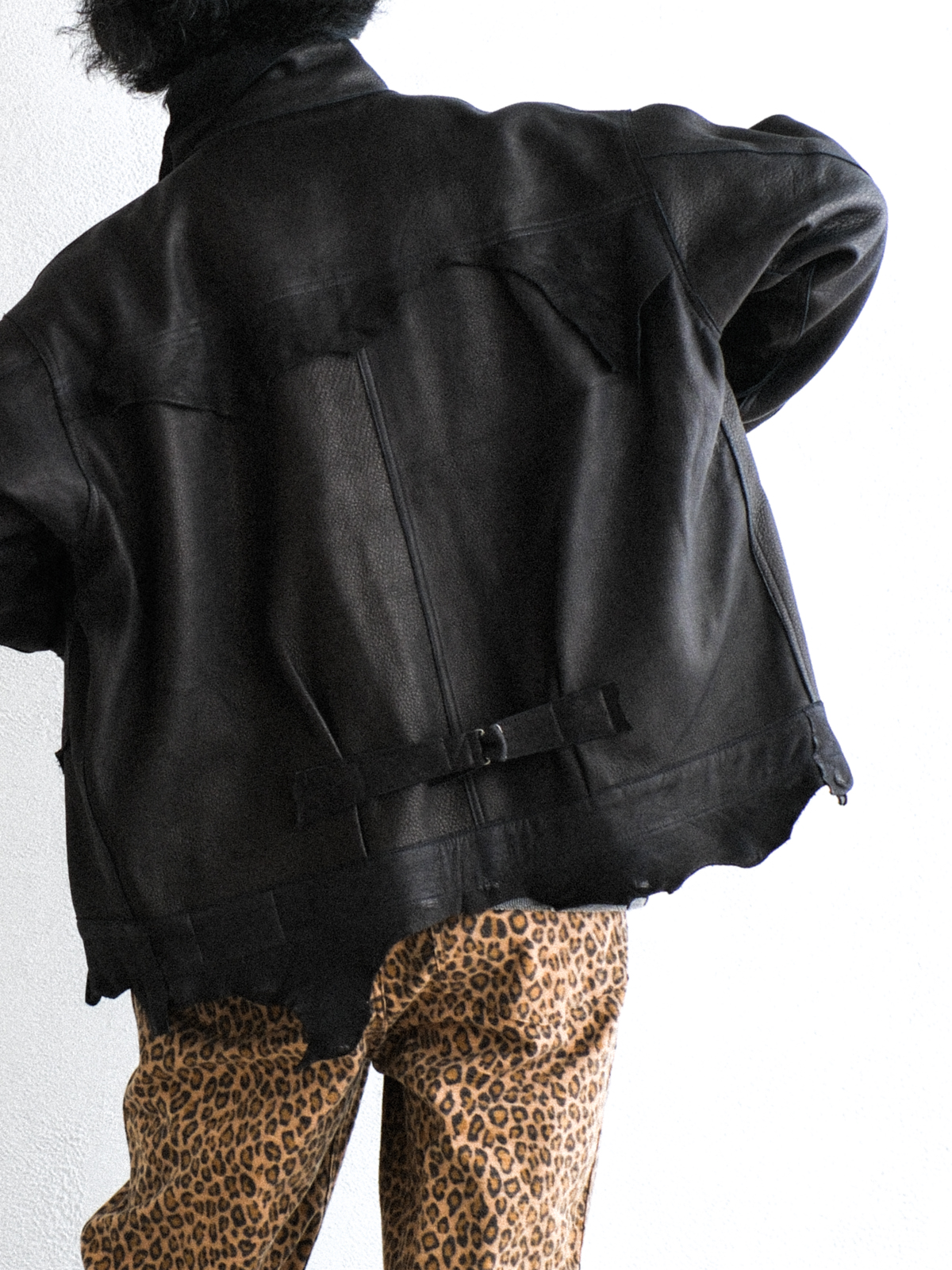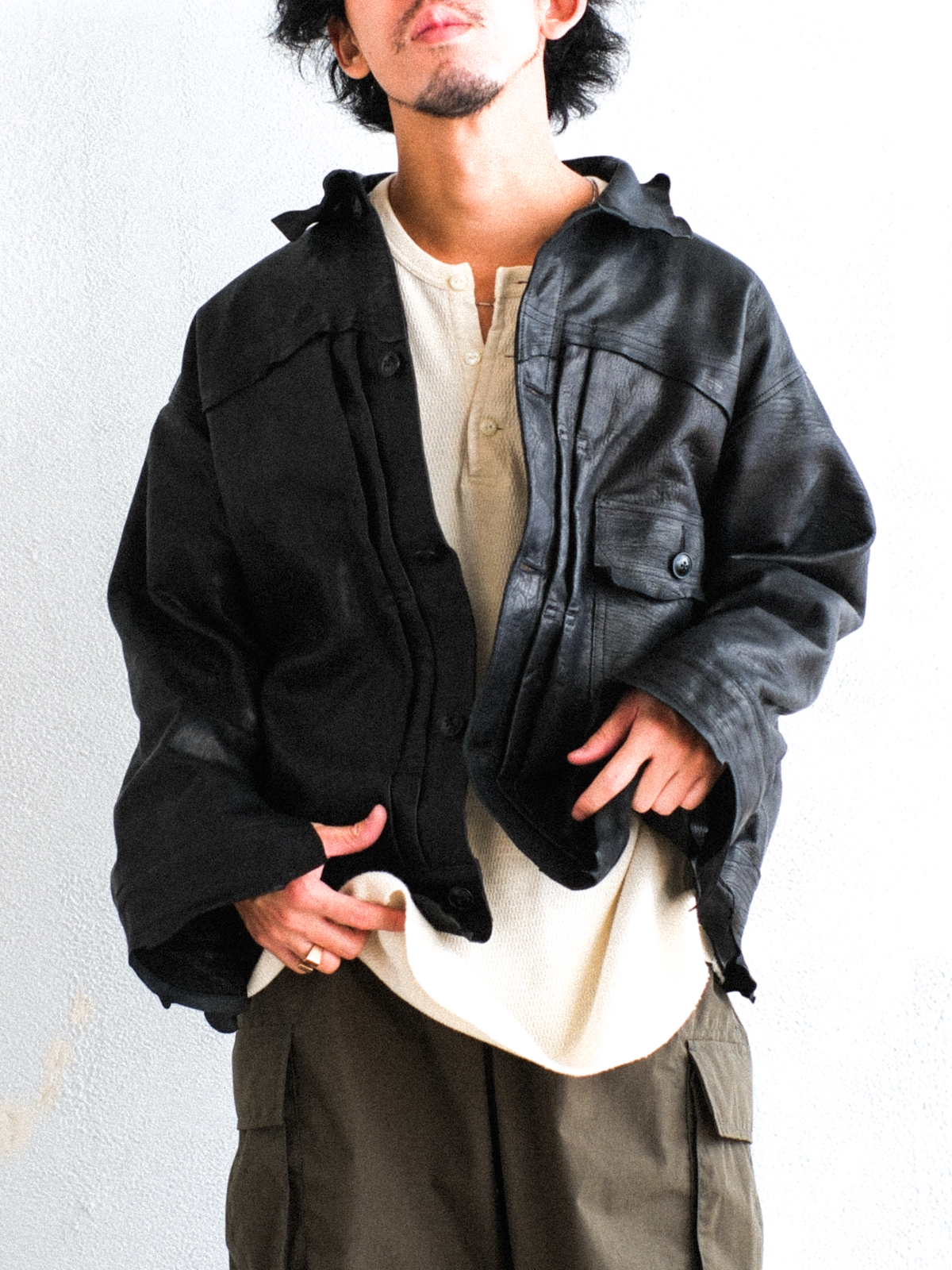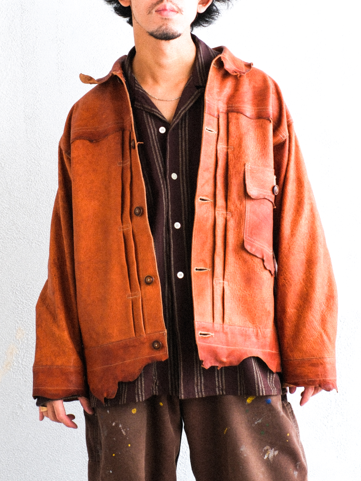 裾や袖口、襟周りや左胸のポケットにいたるまで、元々の革の表情が活かされています。