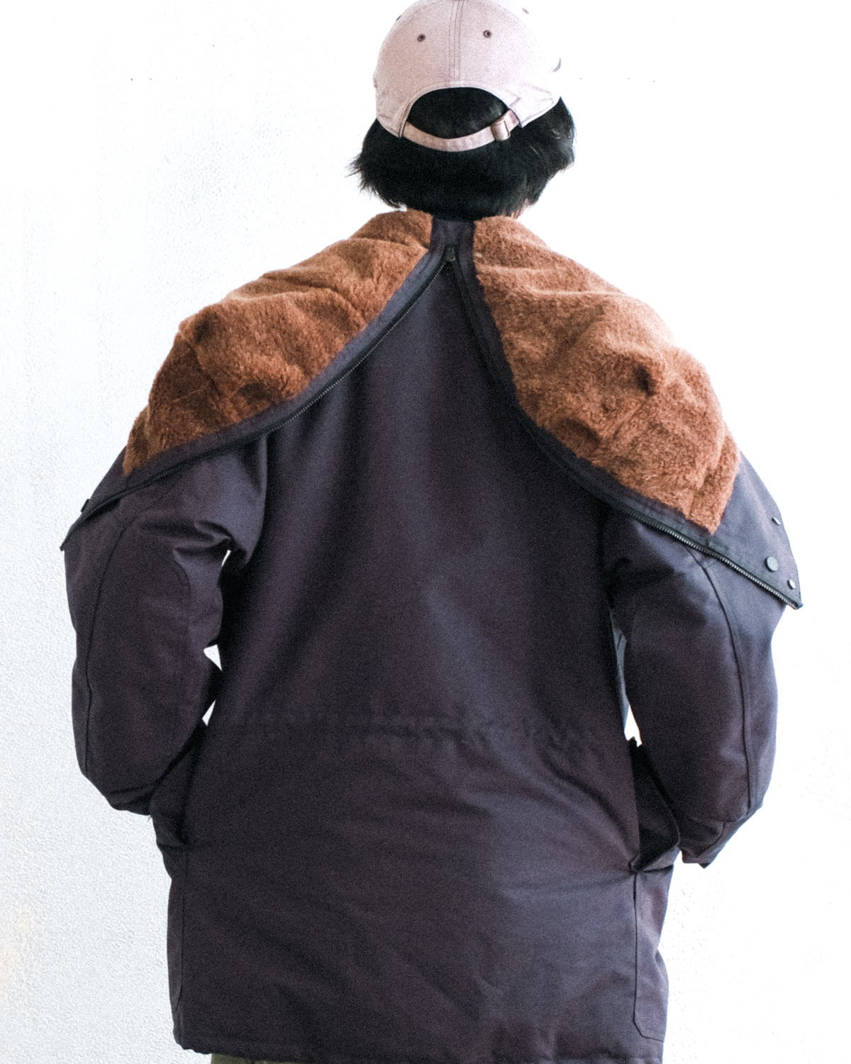 フードをひっくり返し首の後ろに設けられたスナップボタンで固定することで、
