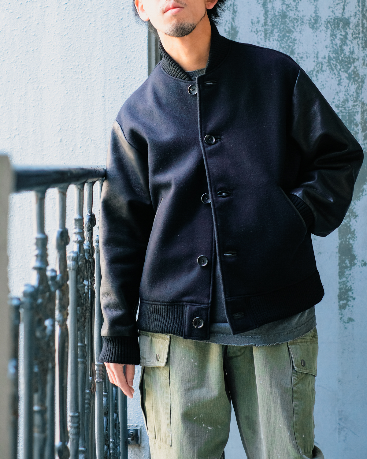 スタジャンというアイテムでここまでモード色の出るクールな1着は見たことがありません。