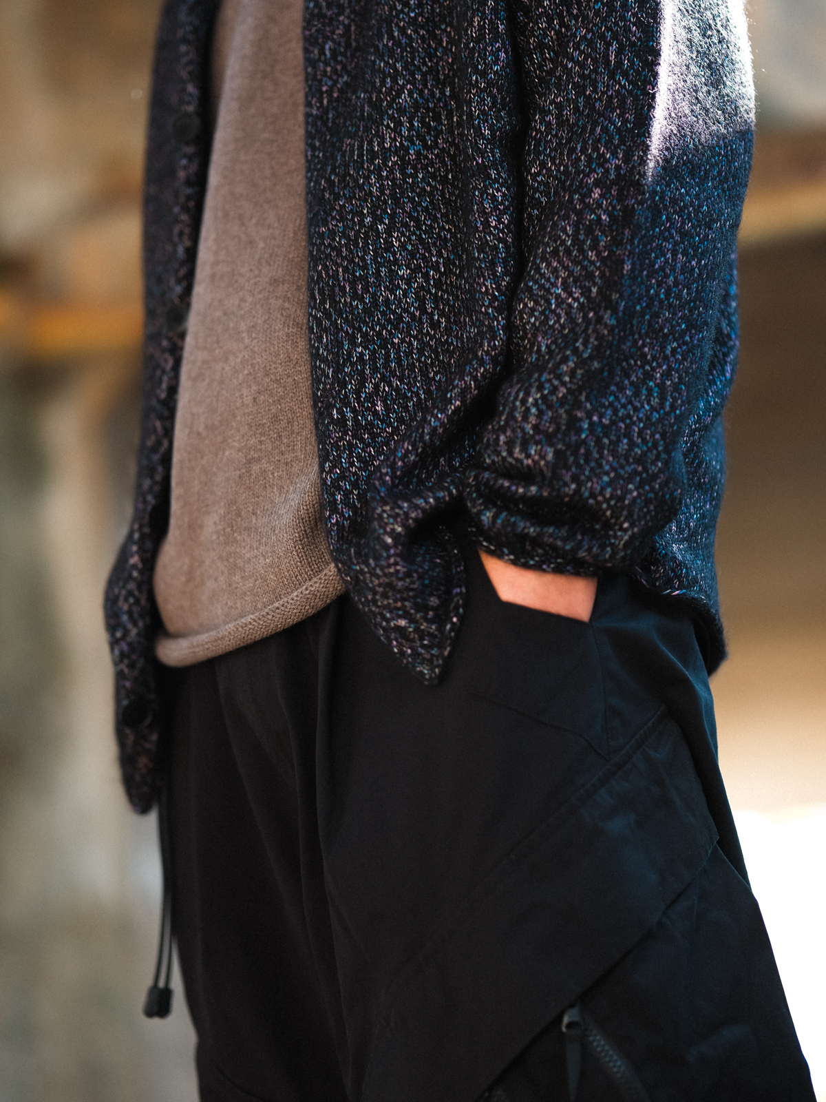 深いブラックの中に、パープルやブルー、ホワイトの糸がキラキラと輝く。