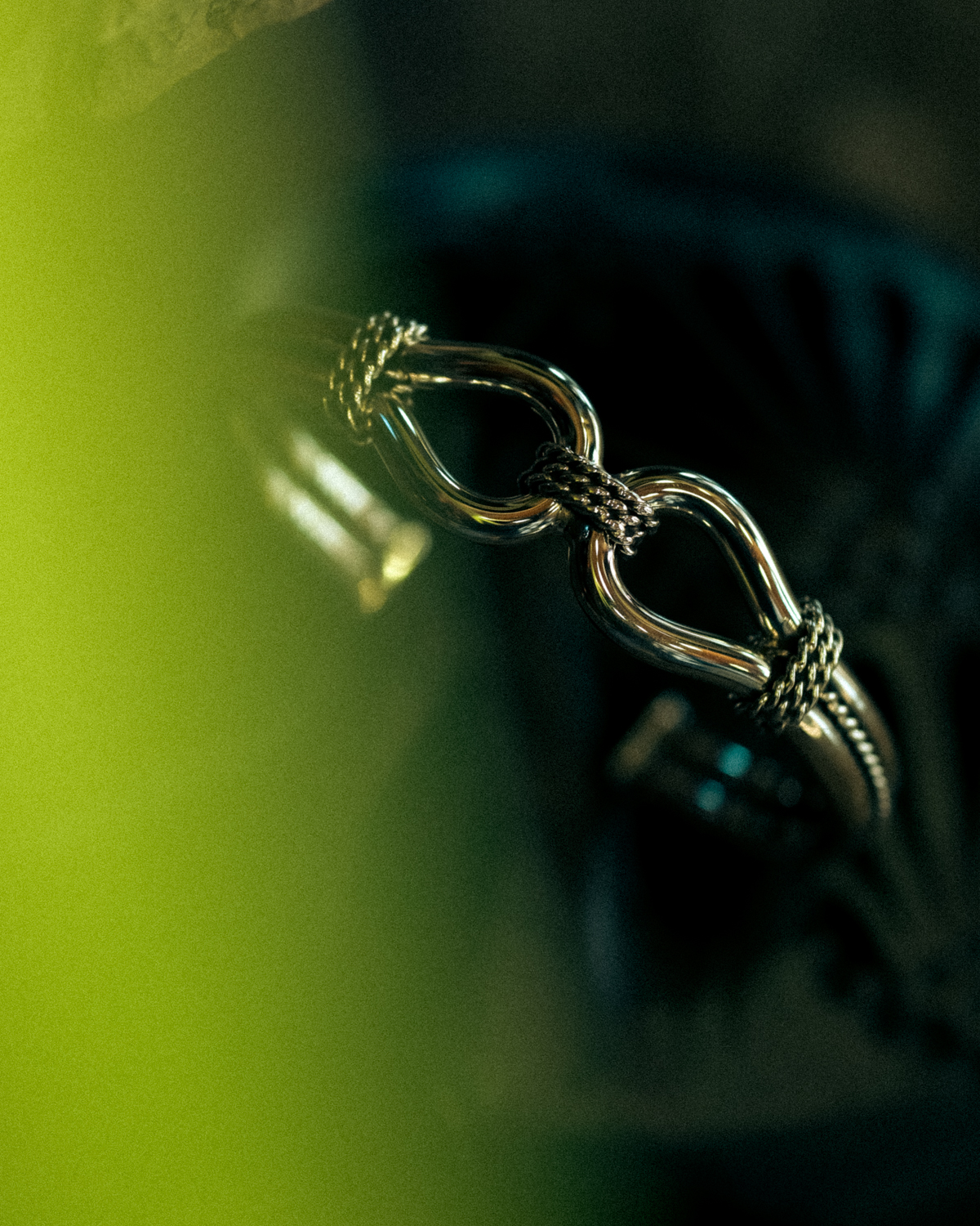 細いシルバーワイヤーを捻じり、巻きつけ、ロウ付けするという繊細な作業が見て取れます。