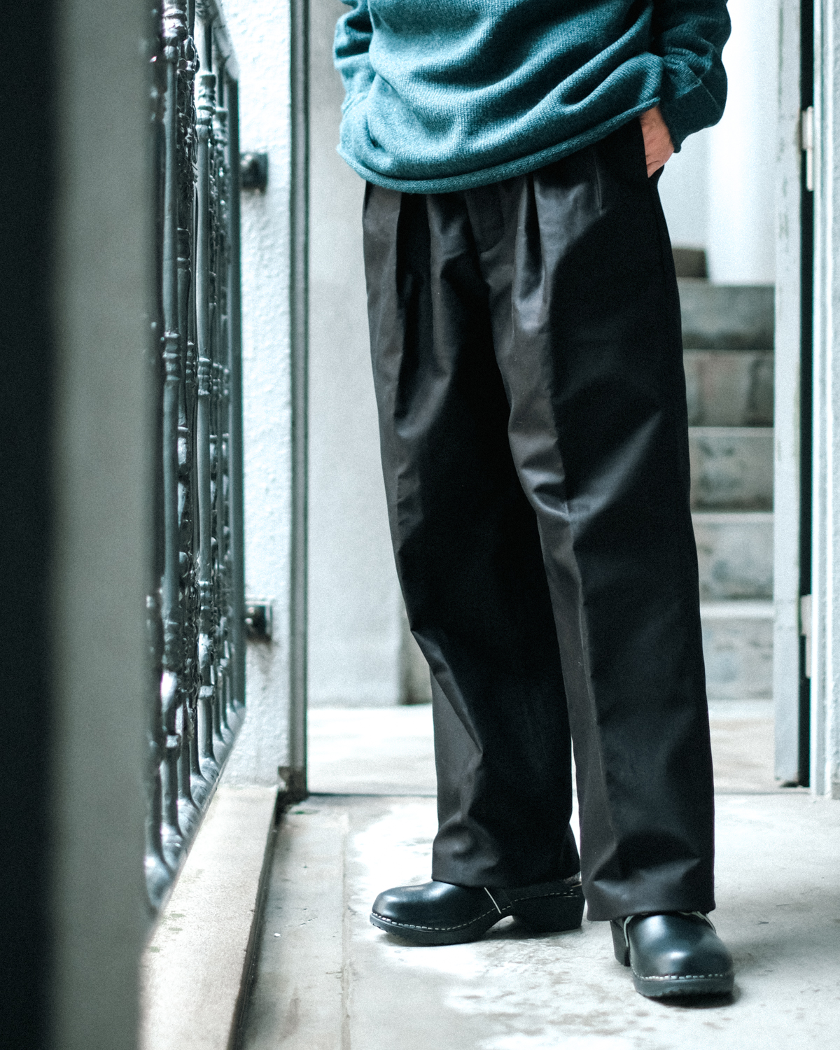 パンツのシルエットは裾に幅を持たせたワイドテーパードです。