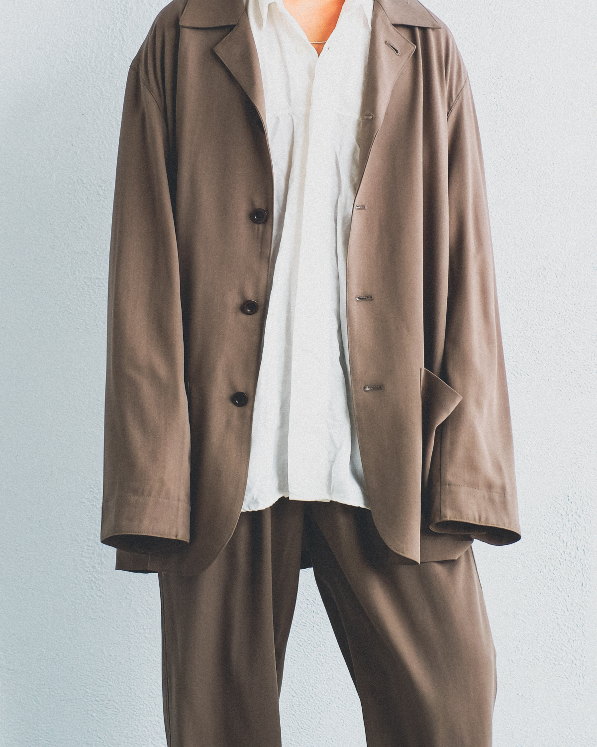 4つボタンに独特のラペル形状によって、シャツジャケット的な印象が漂う『LAZARO』。