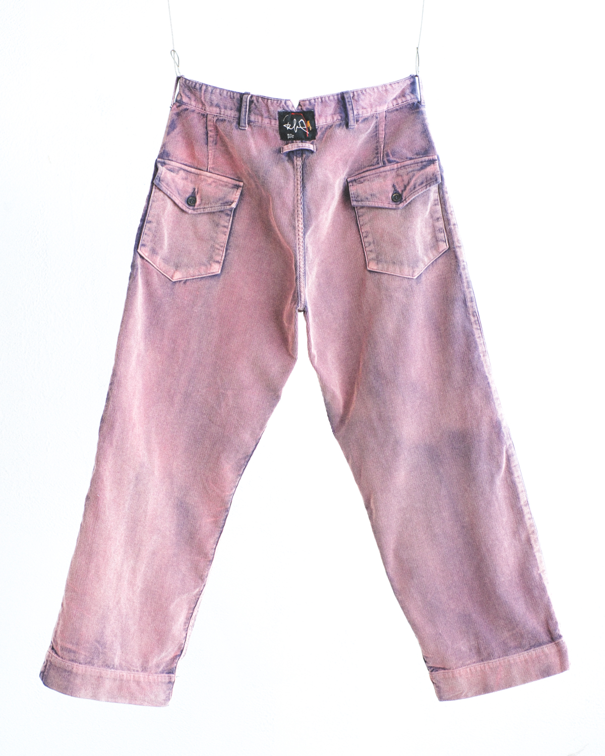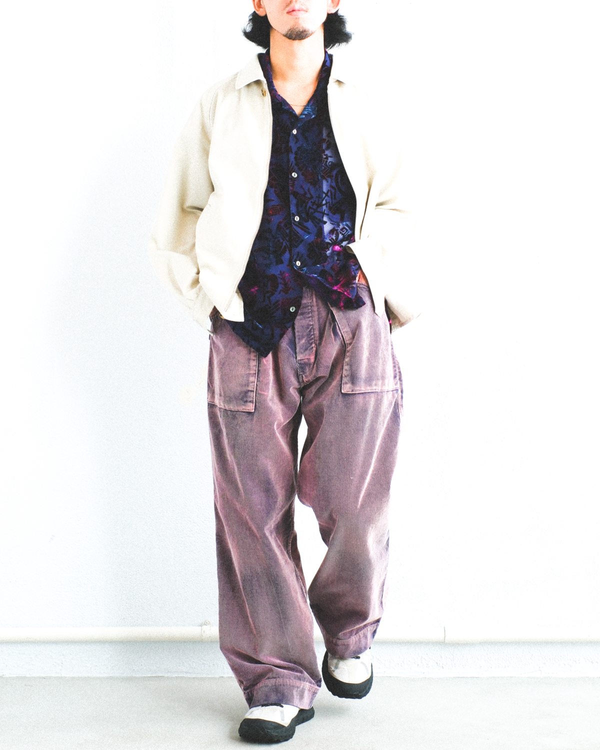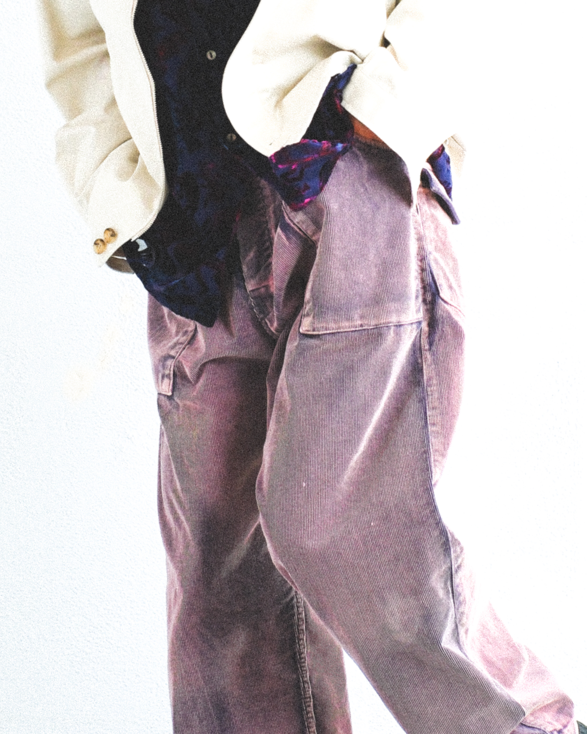 素材はハンドブリーチ(実際に手で薬品を塗りたくるようです)を施したパープルコーデュロイ。