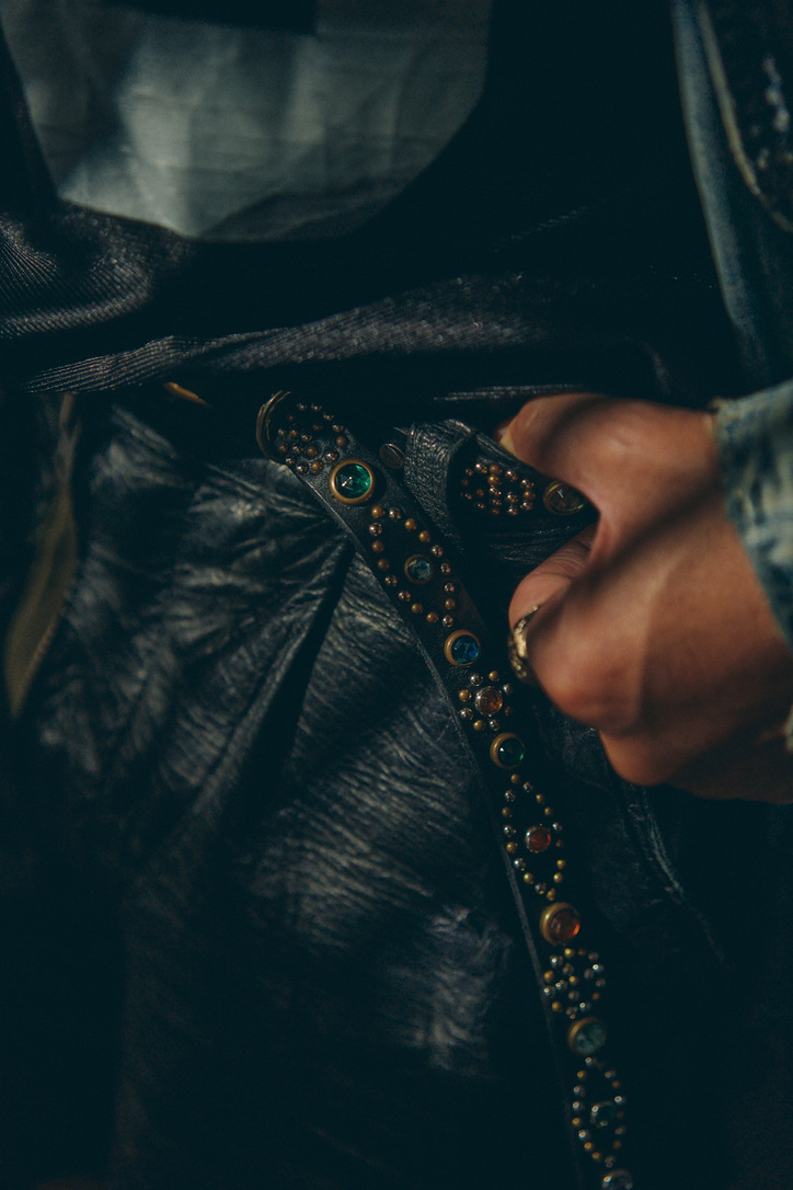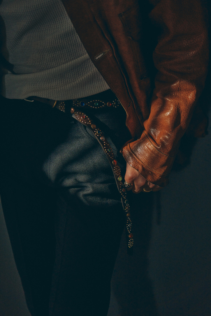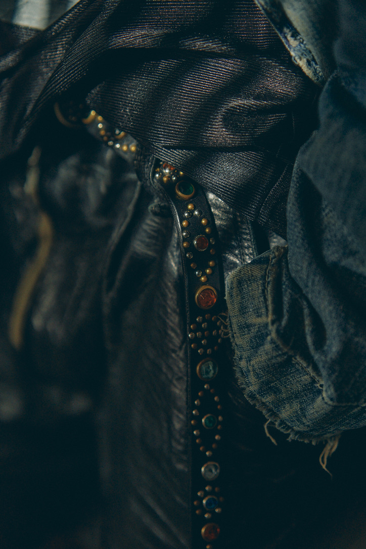 細幅かつ長さのあるベルトに無数のスタッズを打ち込んだ、